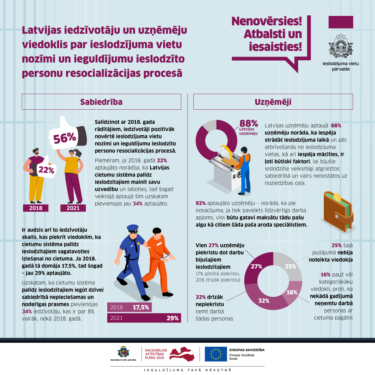 Vienlaikus “Norstat” veiktajā Latvijas uzņēmēju aptaujā 88% uzņēmēju norāda, ka iespēja strādāt ieslodzījuma laikā un pēc atbrīvošanās no ieslodzījuma vietas, kā arī iespēja mācīties, ir ļoti būtiski faktori, lai bijušie ieslodzītie veiksmīgi atgrieztos sabiedrībā un vairs nenostātos uz noziedzības ceļa.