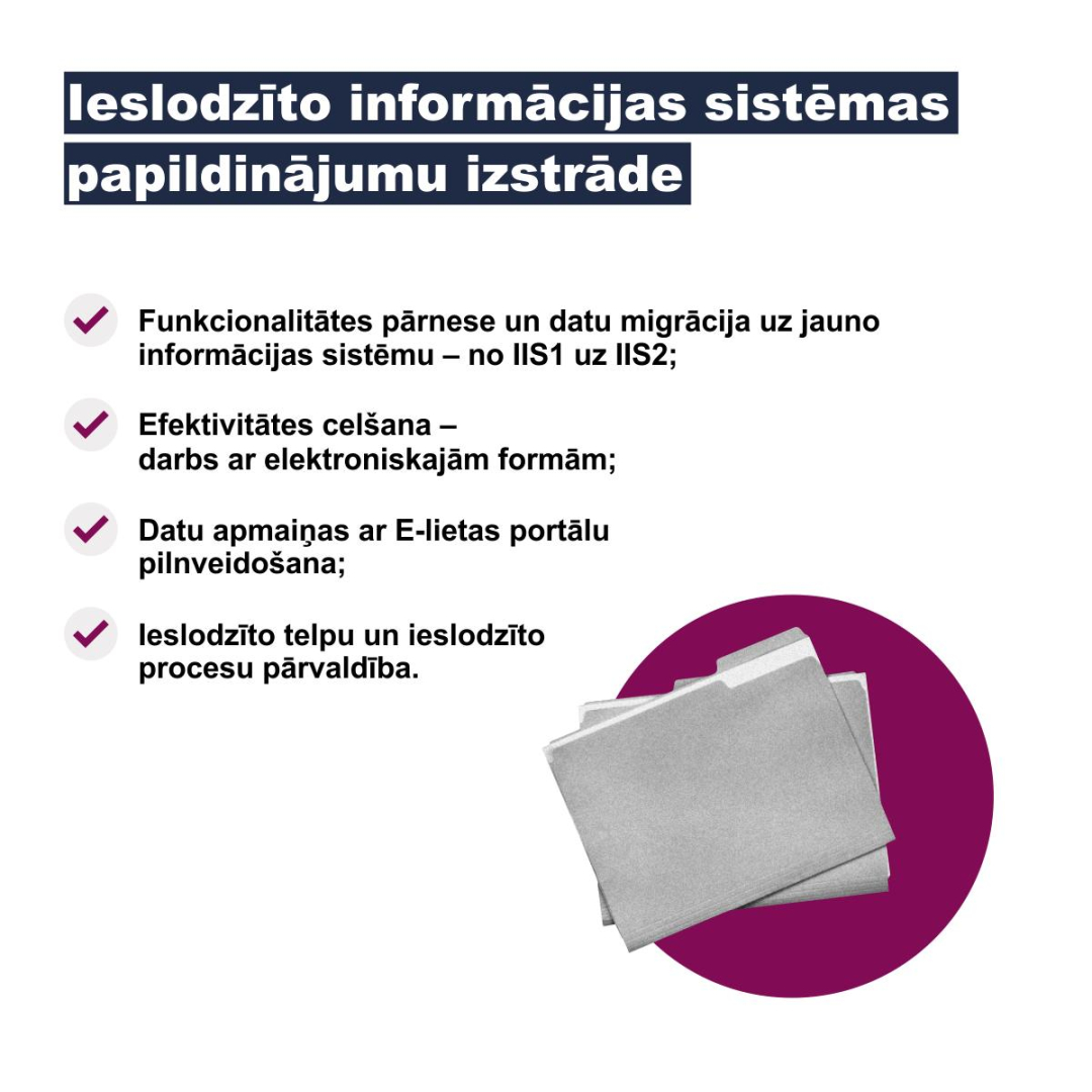 - IIS2 datu apmaiņas ar E-lietas platformu pilnveidošana, efektivizējot elektronisko datu apstrādi. Uzlabojot, automatizējot un pilnveidojot darbības procesus, tajā skaitā pārvaldību IIS2;